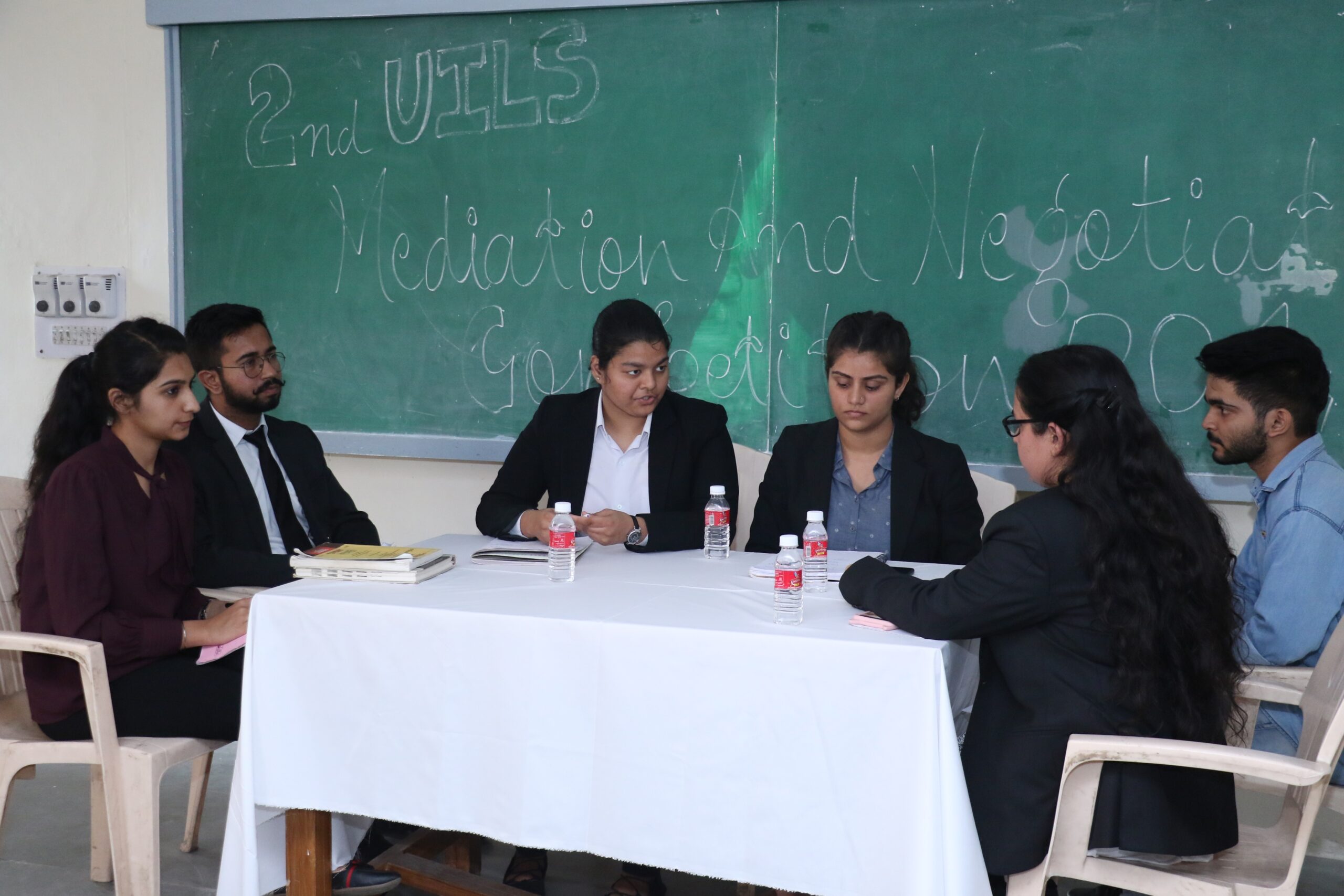 The first day of the UILS Mediation and Negotiation Competition 2018 began with the preliminary round 1 in the morning. 50 teams participated in the 1st round and other 50 teams participated in prelims round 2 in the afternoon. The rounds were judged by 40 senior members of the legal profession who are trained mediators from the Punjab & Haryana High Court. Prof. Rattan Singh, Director UILS and Dr. Shruti Bedi were highly obliged with the warm and cooperative support from the Panjab and Haryana High Court Meditation center and welcomed the judges .
