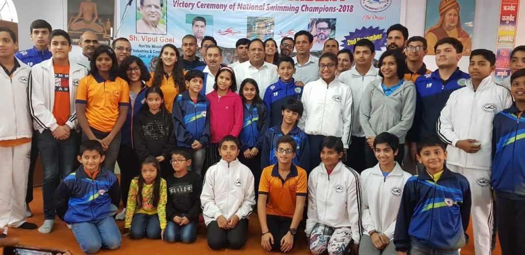 उद्योग मंत्री विपुल गोयल ने स्विमिंग में राष्ट्रीय स्तर पर पदक जीतने वाले खिलाड़ियों का किया सम्मान