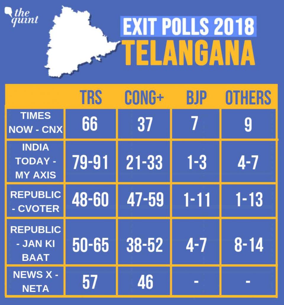 Share Facebook Twitter LinkedIn WhatsApp Email Copy Link Courtesy: The Quint Telangana Rashtra Samithi led by K Chandrashekhar Rao is expected to get a clear majority as exit polls predict the party’s win, with the Congress-led Prajakutami trailing behind.