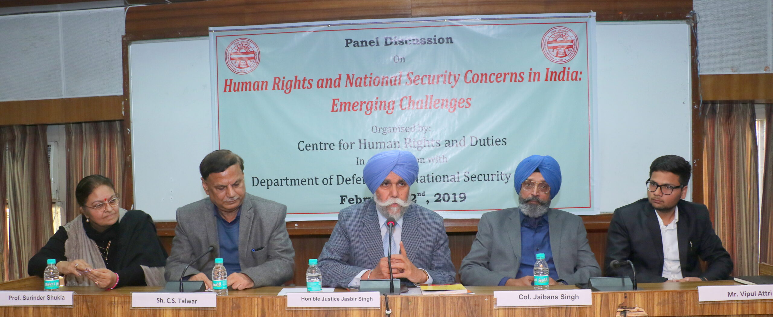 Keeping in view the recent heartbreaking Pulwama Attacks in the state of Jammu & Kashmir, Centre for Human Rights and Duties in collaboration with Department of Defence and National Security Studiesorganised a panel discussion on the topic – “Human Rights and National Security Concerns in India: Emerging Challenges.” The panel consisted of Hon’ble Justice Jasbir Singh as the Chief Guest along with Prof. SurinderShukla, Col. Jaibans Singh, Sh. C. S. Talwar and Mr. VipulAttri as the student representative.