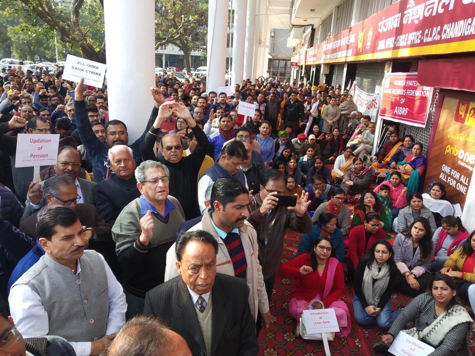 On the call of United Forum of Bank Unions (UFBU), the apex co-ordination of 9 trade unions of Bank employees and Officers, observed strike today i.e. 01/02/2020. This is the 2nd day of two day strike called by UFBU ON 31/01/2020 and 01/02/2020. More than 2500 members of UFBU from the tricity participated in the massive demonstration held in front of PNB, Sector 17, Chandigarh. The two day strike has been called by UFBU against the pending Wage Revision, 5 day Banking as well as other demands. The wage revision of Public sector Bankers is done after 5 years. The present wage revision is due since 01/11/2017. The loud sloganeering by the participants showed the anger of the members. The participation by more than 700 lady members in the demonstration and the slogan shouting by them was a proof of their anguish against the non fulfillment of their demands.