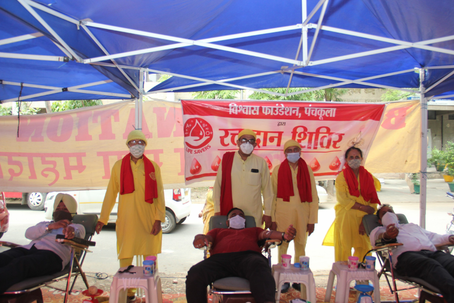 ट्राईसिटी के अस्पतालों अस्पतालों में आयी रक्त की कमी को पूरा करने के लिए विश्वास फाउंडेशन ने गुरुदेव श्री स्वामी विश्वास जी के आशीर्वाद से आज शुक्रवार को मार्किट, सेक्टर 34ए में पासपोर्ट ऑफिस के पास ब्लड डोनेशन कैंप लगाया। यह कैंप इंडियन रेडक्रॉस सोसाइटी पंजाब स्टेट ब्रांच के सहयोग से लगाया गया। शिविर में सामाजिक दूरी, मास्क व सैनिटाईज़ेशन का ख़ास ध्यान रखा गया। 40 रक्तदानियों ने अपनी स्वेछा व उत्साह से रक्तदान किया।