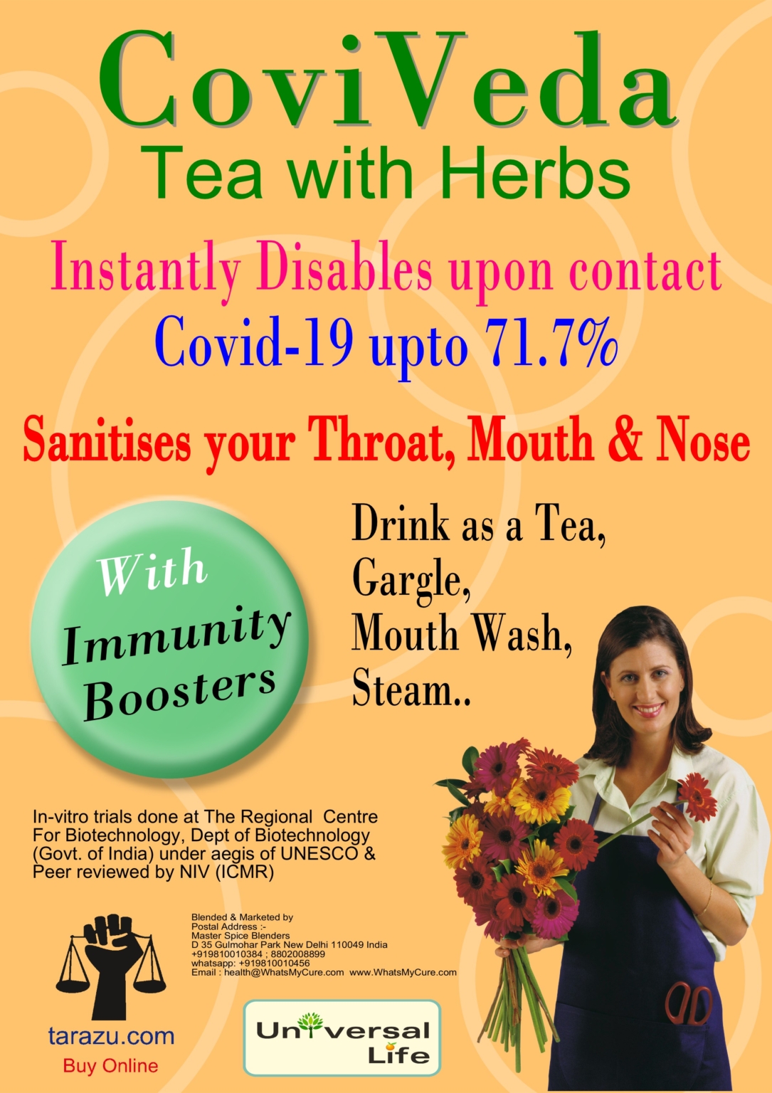 We announce the launch of CoviVeda Herbal Tea / Mix. The World’s first scientifically tested Herbal Mix, demonstrating an Instant Inhibition of up to 71.7% against the Covid-19 Virus during In-Vitro Laboratory testing at the Regional Centre for Biotechnology. This neutralizing ability of the Virus comes with zero Cytotoxicity towards Healthy cells. The test was conducted at a BSL 3 Laboratory of Regional Centre for Biotechnology, established by the Department of Biotechnology, Government of India, and set up under the aegis of UNESCO, which is the United Nations Educational and Scientific Research Organization. The trials were conducted on Monkey Vero Cells as per the most modern scientific and Internationally accepted Norms. The study and trials were thereafter Peer reviewed by the scientists and Professor Priya Abraham of the National Institute of Virology, (ICMR). Ancient Indian Knowledge of herbs is now backed by scientific proof as per international testing norms.