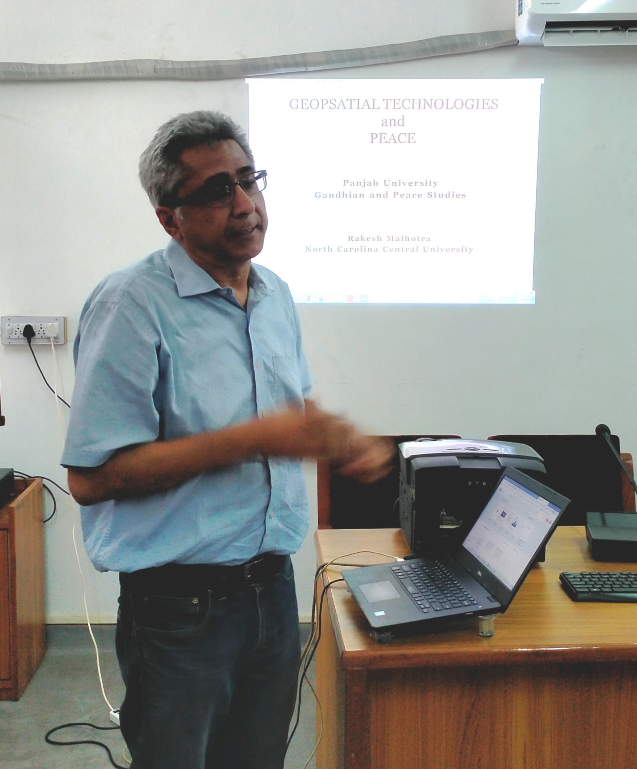 The presentation focuses on the Geospatial Technologies which are proliferating and are constantly in use in our daily lives in one way or the other way. It also focused on the use of Geospatial Technologies, tools such as GPS, GIS and remote sensing and their advantages and disadvantages were also discussed. The key focus of this presentation was GPS (Global Positioning Systems) technology and its use. Even though GPS was invented for the US Department of Defence, GPS is now in civilian use and is constantly also used for peaceful purposes. Location and time related services are used all over and are included in day to day uses such as ATM machines. These views were expressed by Dr. Rakesh Malhotra, Associate Professor, Department of Environmental, Earth and Geospatial Sciences, NORTH CAROLINA CENTRAL UNIVERSITY, Durham, North Carolina, USA, who is on Foreign Visiting Faculty in the Department of Gandhian and Peace Studies, PU, Chandigarh. In his expository talk, Dr. Rakesh highlighted that the Location Services, GIS Data and cameras are important but also come with drawbacks such as privacy and data storage. The all kinds of ATM machines, smart phones and smart watches, drones, missiles, navigation tools and other such gadgets are working all because of the GPS system though it’s a one-way communication but it is helping many to reach their destinations.