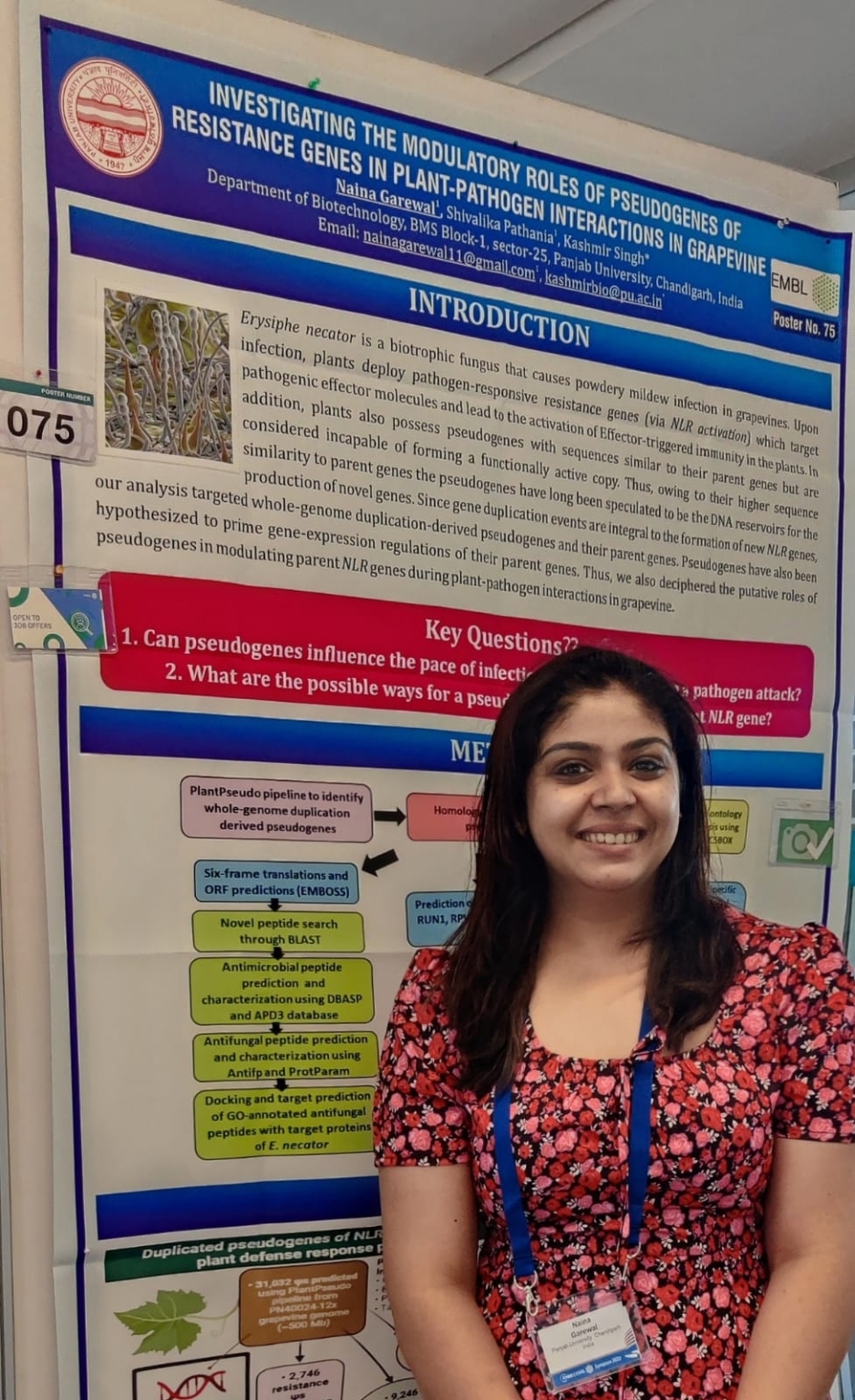 Ms. Naina Garewal of Panjab University, Chandigarh went to present her research work at European Molecular biology labs (EMBL) conference on “Innate immunity in host-pathogen interactions in grapevine” held from 17-20th July 2022 at Heidelberg,Germany. She is doing her Ph.D. under Dr. Kashmir Singh, Professor and Chairperson at the Department of Biotechnology and Coordinator at DST Centre for Policy Research, Panjab University, Chandigarh. Her Ph.D. research is on analysing the interplay between resistance genes as well as their pseudogenes in plant-fungus interactions of grapevine fungus powdery mildew. She presented a part of her research work through the poster titled “Investigating the modulatory roles of pseudogenes of resistance genes in plant-pathogen interactions in grapevine”. This research work primarily focuses on how pseudogenes which are considered as junk or inactive and were previously discarded as irrelevant could have antimicrobial and antifungal potential in them and might be impacting activation and inactivation of plant resistance genes especially in grapes which are extremely prone to fungal pathogen attacks. They are currently working on the prospect on bringing these dead gene elements to life through artificial gene resurrection techniques of synthetic biology. They believe these pseudogenes might be important in giving rise to new genes which impart resistance in plants against fungal infection. This research study is the first ever study on pseudogenes of resistance genes in plants which are considered to be key in driving the plant defense response against the pathogens.