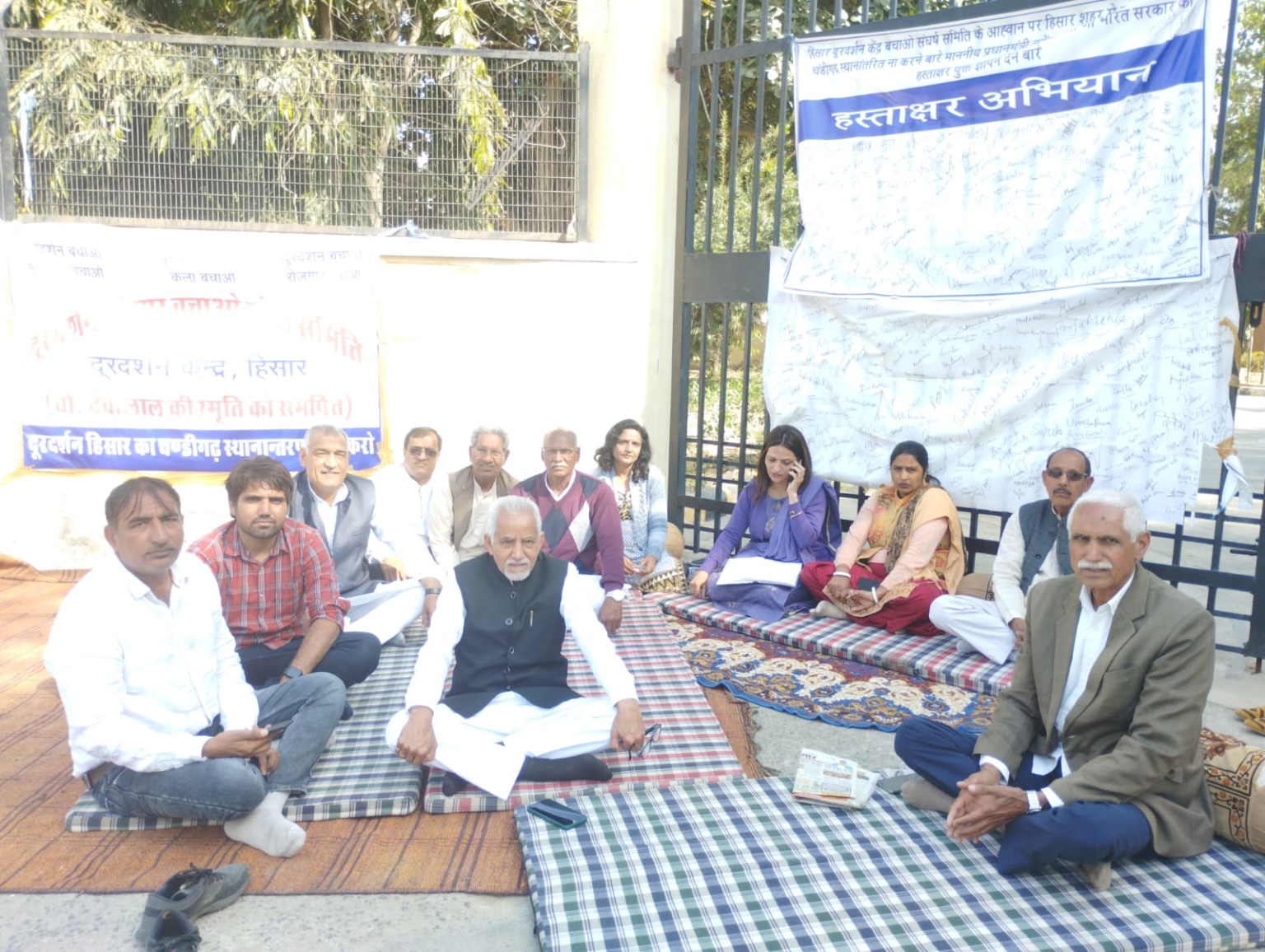 केंद्र सरकार द्वारा दूरदर्शन केंद्र चंडीगढ़ स्थानांतरित करने के विरोध में दूरदर्शन बचाओ संघर्ष समिति के बैनर तले धरना प्रदर्शन मंगलवार को 41वें दिन राजेंद्र दुहन की अध्यक्षता में जारी रहा। बुधवार को राजगढ़ रोड हिसार से लघु सचिवालय तक जुलूस निकालते हुए राज्यपाल मुख्यमंत्री, उपमुख्यमंत्री और सभी विधायकों के नाम उपायुक्त महोदय के माध्यम से ज्ञापन सौंपा जाएगा।समिति के संयोजक नरेंद्र कौशिक धरतीपकड़ ने बताया कि आज दूरदर्शन हरियाणा की स्थापना करवाने वाली स्वर्गीय सुषमा स्वराज जी की जन्मतिथि पर उन्हें श्रद्धांजलि दी गई। उन्होंने कहा कि अगर आज वो जीवित होती तो दूरदर्शन हरियाणा को यहां से बंद कभी नहीं होने देती। साथ ही आज ही के दिन हुए पुलवामा हमले में शहीद हुए सैनिकों को याद कर नमन किया गया।धरने पर आज इनेलो पार्टी से आदमपुर उपचुनाव के प्रत्याशी रहे कुरडाराम नंबरदार भी धरने को समर्थन देने आए। उन्होंने कहा इनेलो पार्टी का समर्थन संघर्ष समिति के साथ है। आज के धरने पर कामिनी मलिक, रितु कौशिक, ईश्वर सिंह सिहाग, दलबीर किरमारा, इंद्र सिंह मलिक, सुरजाराम झाझडि?ा, आरपी सैनी, मुकेश, ललिता, दीपक, धन्नु राम, कुलबीर दुहन, जोगेंद्र, योगेंद्र पाल बामल, महावीर दुहन, जोगी राम पंघाल आदि उपस्थित थे।
