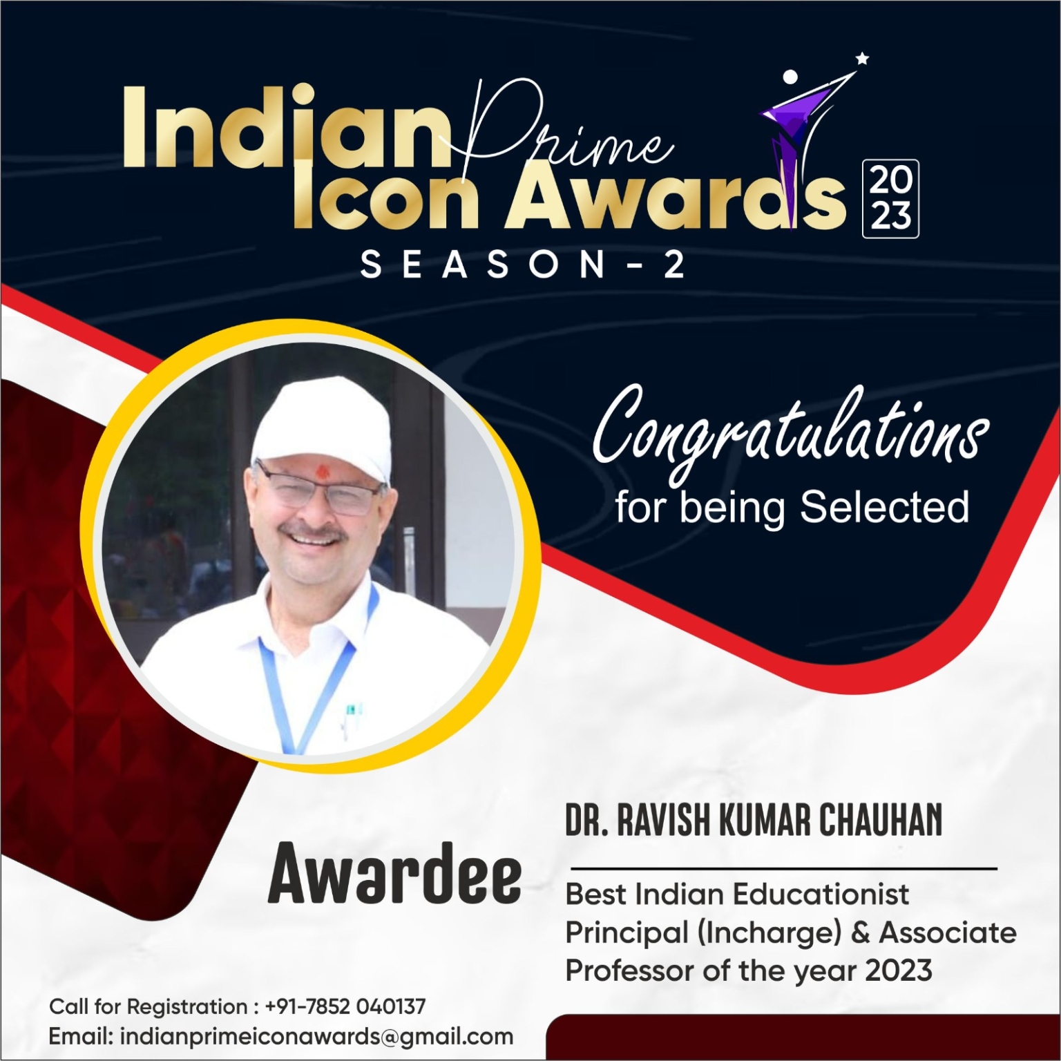 शिक्षा के क्षेत्र मे विशेष योगदान के लिए डा.रविश कुमार चौहान को इण्डियन ग्लोबल आईकान द्वारा “इण्डियन आईकान प्राइम अवार्ड्स – 2023” से सम्मानित किया गया। डॉक्टर चौहान को संस्था द्वारा “सर्टिफिकेट आफ एक्सीलेंस” एवं स्मृति चिन्ह भेट कर सम्मानित किया गया। आपको बता दें कि इस से पूर्व भी डा.चौहान को शिक्षा एवं समाजिक क्षेत्र में उत्कृष्ट प्रदर्शन के लिए विभिन्न संस्थाओं द्वारा अलंकृत किया जा चुका है। जिनमें मुख्य रूप से दैनिक भास्कर समूह द्वारा “आल इंडिया हिन्दी प्रस्ताव लेखन प्रतियोगिता जयपुर लिटरेचर फैस्टिवल” मे प्रमाणपत्र तथा नकद राशि द्वारा सम्मानित, पी.जी.आई रोहतक एवं हरियाणा ब्लड ट्रांसफ्यूजन काउन्सिल पंचकूला, स्वामी विवेकानंद योग सेवा संस्थान सहारनपुर (रजिo), नेहरु युवा केन्द्र कुरुक्षेत्र, शिक्षक दिवस के अवसर पर दैनिक भास्कर समूह यमुनानगर, गुलमोहर अकादमी द्वारा “यमुनानगर जेम अवार्ड आदि शामिल हैं।