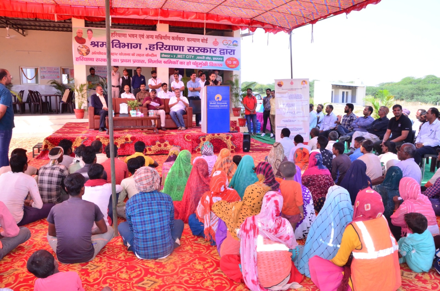 मुख्य अतिथि सुश्री सलोनी शर्मा, आईएएस, अति. उपायुक्त जिला झज्जर ने सर्वप्रथम अपने भाषण में सभी श्रमिकों को शुभकामनाएं दी और कहा कि रिलायंस एवं श्रम विभाग का यह प्रयास प्रंशसनीय है। उन्होंने कहा कि मुख्यमंत्री मनोहर लाल ने हरियाणा राज्य में 100 अंत्योदय आहार योजना कैंटीन खोलने की घोषणा विश्वकर्मा दिवस के अवसर पर की थी, उस 100 कैंटीन में से एक कैंटीन आज एमईटी सिटी सेक्टर 7 जिला झज्जर में में खोली जा रही है। उन्होंने बताया कि एमईटी क्षेत्र में लगभग 3000 से अधिक कामगार लोग कार्य में लगे हुए है तथा इस कैंटीन से उन सभी कामगारों को फायदा होगा।