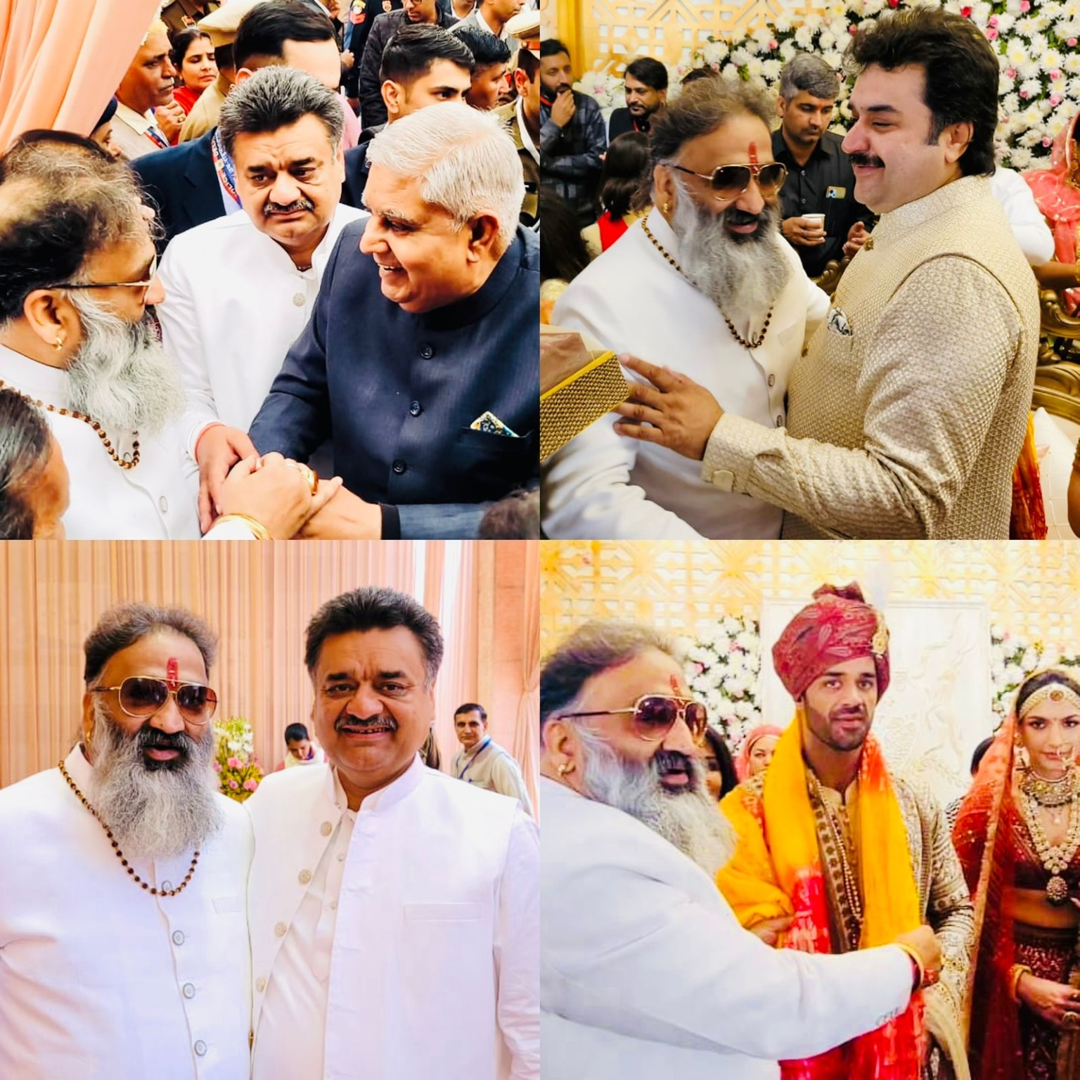 हरियाणा के पूर्व मुख्यमंत्री स्व. चौधरी भजन लाल के परिवार को राजनीतिक रूतबा, देश की राजनीति व जनता में कायम है। चौधरी भजन लाल के पोते व कुलदीप बिश्नोई के दोनों बेटों भव्य व चैतन्य के विवाह समारोह के बाद आदमपुर मंडी में रखे भोज में दो लाख से अधिक लोग शामिल हुए व देश के उपराष्टÑपति जगदीप धनखड़ व उनकी धर्मपत्नी सुदेश धनखड़ सहित वीवीआईपी पहुंचे। इस मौके पर एंटी टेरोरिस्ट फ्रंट इंडिया के राष्ट्रीय अध्यक्ष व विश्व हिंदू तख्त प्रमुख वीरेश शांडिल्य परिजनों के साथ शादी समारोह में शामिल हुए व बेटे भव्य, चैतन्य व पुत्रवधु परी व सृष्टि को आशीर्वाद दिया और कुलदीप बिश्नोई, रेणुका बिश्नोई व पूर्व डिप्टी सीएम चंद्रमोहन व उनकी पत्नी सीमा बिश्नोई सहित माता जस्मा देवी को बधाई दी। इस मौके पर समारोह में विशेष तौर पर पहुंचे देश के उपराष्टÑपति जगदीप धनखड़ व उनकी धर्मपत्नी सुदेश धनखड़ को रिसेप्शन मौके पर पूर्व डिप्टी सीएम चंद्रमोहन ने रिसीव किया। इस मौके पर पूर्व डिप्टी सीएम चंद्रमोहन ने विश्व हिंदू तख्त प्रमुख वीरेश शांडिल्य की उपराष्ट्रपति जगदीप धनखड़ से मुलाकात करवाई और पांच मिनट मुख्य द्वार पर ही उपराष्ट्रपति से वीरेश शांडिल्य की चर्चा हुई। वीरेश शांडिल्य ने बताया कि शादी समारोह में फाइव स्टार नुमा होटल का टेंट लगा हुआ था और वीवीआईपी सहित सभी लोगों के लिए एक जैसा भोजन था। इस मौक पर शादी समारोह में वीरेश शांडिल्य से मुख्यमंत्री मनोहर लाल खट्टर, राज्यपाल बंडारू दत्तात्रेय, उड़ीसा के राज्यपाल प्रो. गणेशी लाल, पूर्व मुख्यमंत्री ओमप्रकाश चौटाला, कृषिमंत्री जेपी दलाल, ट्रांसपोर्ट मंत्री मूलचंद शर्मा, जेलमंत्री रणजीत सिंह, सांसद डीपी वत्स, सांसद धर्मवीर सिंह, राज्यसभा सांसद कृष्ण लाल, सांसद बरजिंदर सिंह, विधायक बीबी बत्रा, विधायक गोलन, विधायक रामकुमार गौतम, पूर्व मंत्री छतरपाल सिंह व डीजीपी आरसी मिश्रा, एडीजीपी श्रीकांत जाधव सहित कई सांसदों, विधायकों व मंत्रियों से मुलाकात हुई। वीरेश शांडिल्य के साथ शिव रंजन, दिनेश गौड आदि भी मौजूद थे। वीेरेश शांडिल्य ने कहा कि कुलदीप बिश्नोई के दोनों बेटों की शादी समारोह में पिता कुलदीप बिश्नोई व ताऊ चंद्रमोहन ने तमाम अतिथियों का स्वागत किया और कुलदीप बिश्नोई ने चौधरी भजन लाल के समय का रूतबा लोगों को याद दिलाया। लोगों में चर्चा थी कि आज चौधरी भजन लाल परिवार का रूतबा हरियाणा, पंजाब, राजस्थान, चंडीगढ़, हिमाचल सहित उत्तर भारत में हैं और आज भी भजन लाल परिवार की राजनीतिक पकड़ जमीन के अंदर तक है। शांडिल्य ने इस मौक पर न केवल भव्य बिश्नोई व चैतन्य को अयोध्या से मंगवाई चुनरी पहनाकर आशीर्वाद दिया जबकि भव्य बिश्नोई की धर्मपत्नी आईएएस परी व चैतन्य की धर्मपत