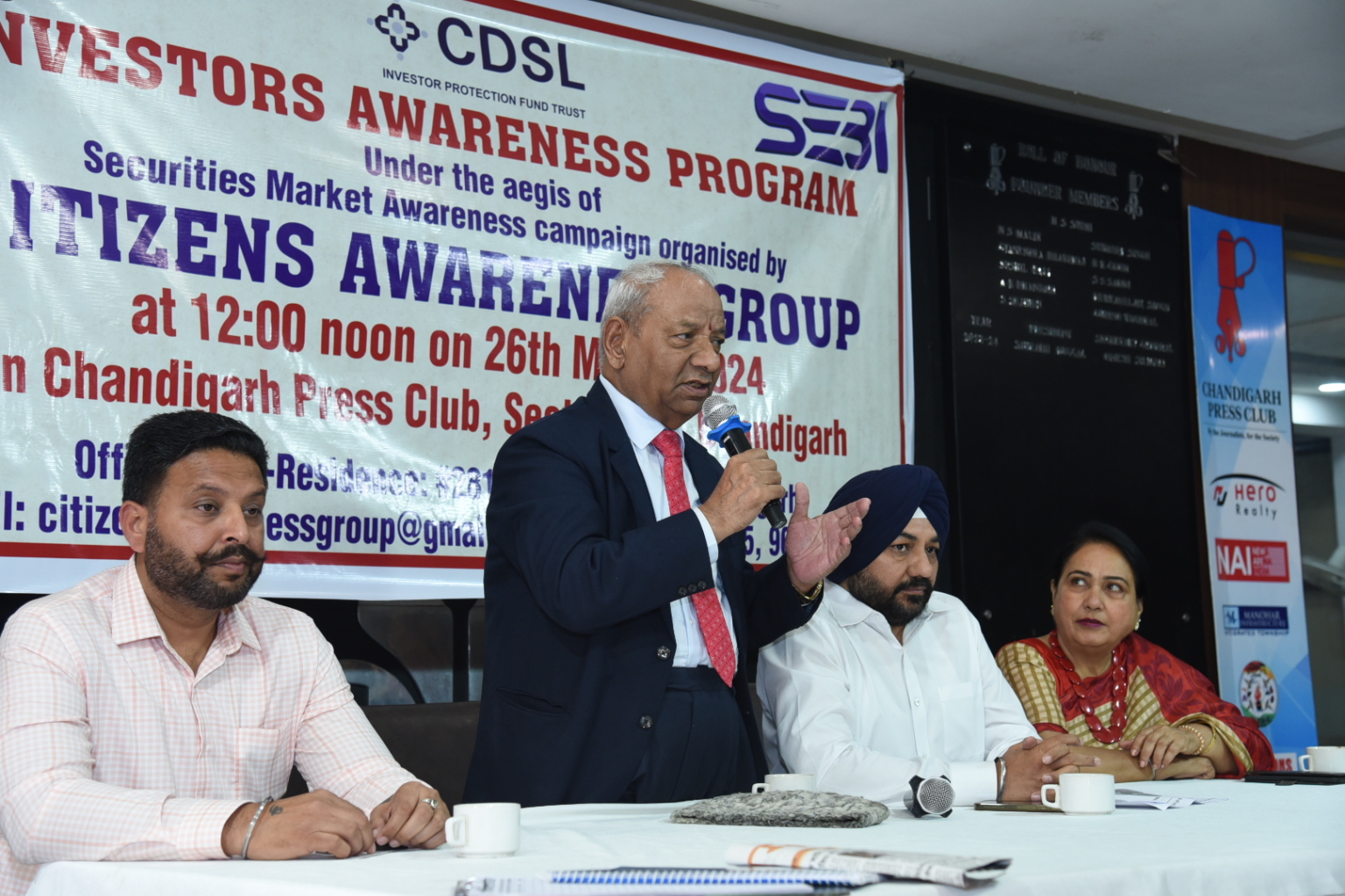 सिटीजन अवेयरनेस ग्रुप (सीएजी) ने सिक्योरिटीज एंड एक्सचेंज बोर्ड ऑफ इंडिया (सेबी) और सेंट्रल डिपॉजिटरी सर्विसेज (इंडिया) लिमिटेड (सीडीएसएल) के सहयोग से चंडीगढ़ प्रेस क्लब, सेक्टर 27, चंडीगढ़ में एक निवेशक जागरूकता कार्यक्रम का आयोजन किया। .