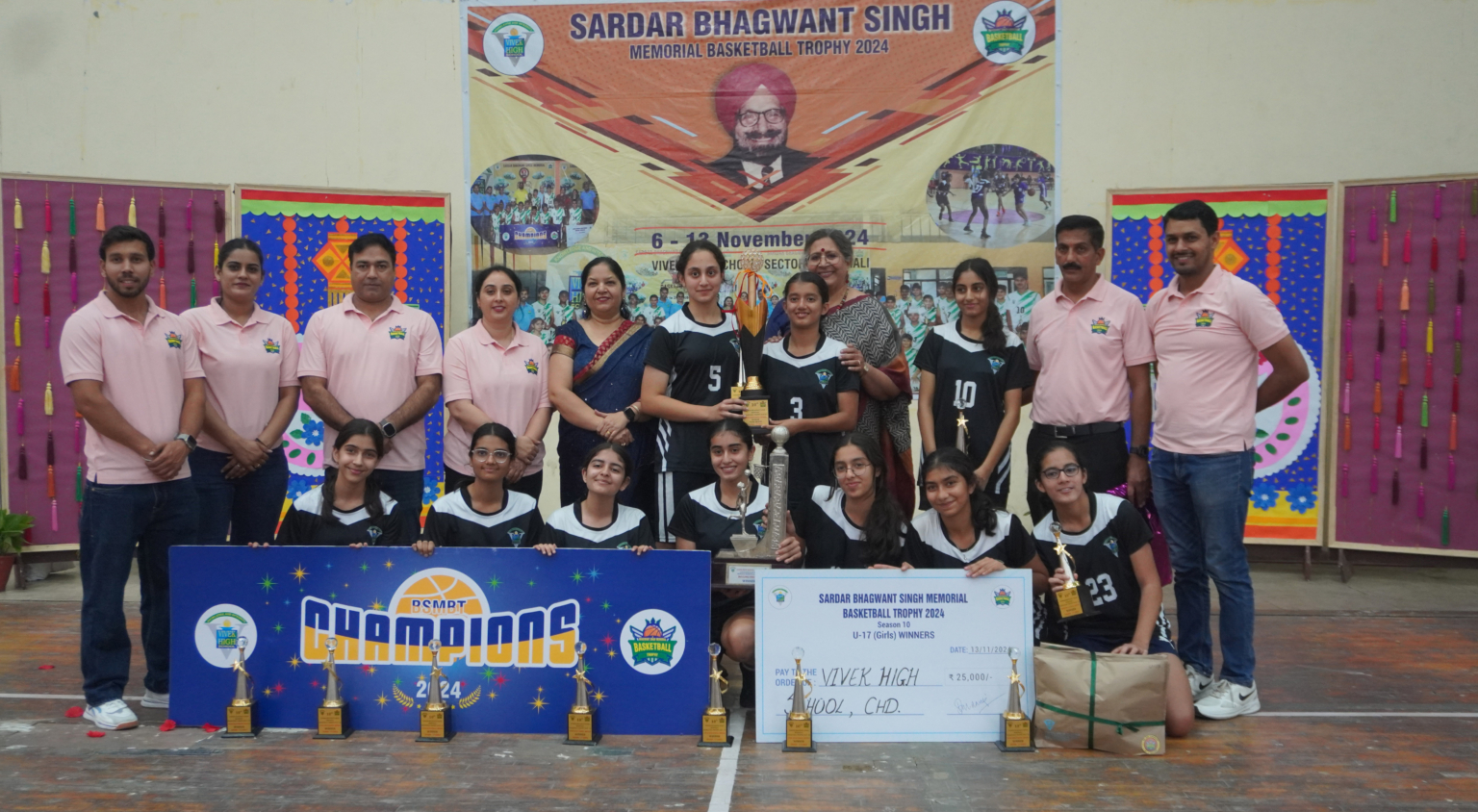 विवेक हाई स्कूल मोहाली द्वारा आयोजित सरदार भगवंत सिंह मेमोरियल बास्केटबॉल ट्रॉफी (BSMBT) 2024 का समापन मोहाली के सेक्टर 78 स्थित इनडोर बास्केटबॉल कोर्ट, जीएमएडीए स्पोर्ट्स कॉम्प्लेक्स में हुआ। मोहाली के जिला खेल अधिकारी रूपेश कुमार बेगारा टूर्नामेंट के ग्रैंड फिनाले में मुख्य अतिथि थे। उन्होंने सभी विजेताओं को उनके उत्कृष्ट प्रदर्शन के लिए बधाई दी।